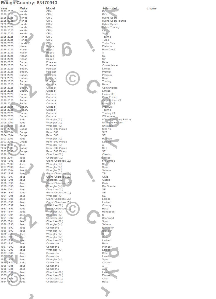 Below is an abbreviated list of applications for the Series 83 Wheel.Cherokee (XJ), Comanche, CR-V, Forester, Grand Cherokee (ZJ), Outback, Ram 1500, Rogue, Wrangler (TJ), Wrangler (YJ), Dodge, Honda, Jeep, Nissan, Subaru, 2025, 2006, 2005, 2004, 2003