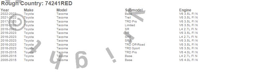 Below is an abbreviated list of applications for the Suspension Lift Kit w/Shocks.Tacoma, Toyota, 2023, 2022, 2021, 2020, 2019, 2018, 2017, 2016, 2015, 2014, 2013, 2012, 2011, 2010, 2009, 2008, 2007, 2006
