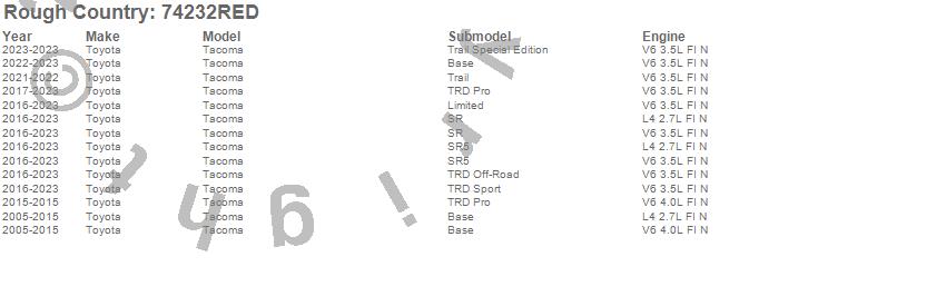 Brand: Rough CountryPart Number: 74232REDLift Kit-Suspension w/Shock Type: 3.5 in. Lift - Red Upper Control Arms - N3 Struts - w/N3 Rear ShocksUPC: 840269940668