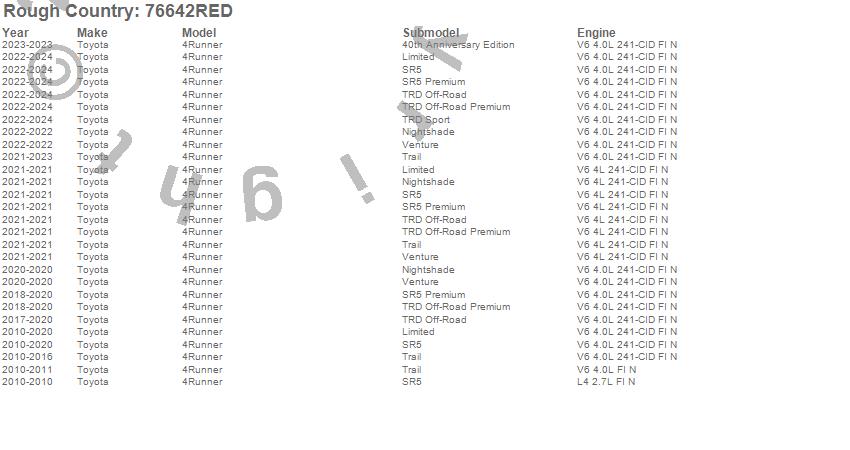 Below is an abbreviated list of applications for the Suspension Lift Kit w/Shocks.4Runner, Toyota, 2024, 2023, 2022, 2021, 2020, 2019, 2018, 2017, 2016, 2015, 2014, 2013, 2012, 2011, 2010