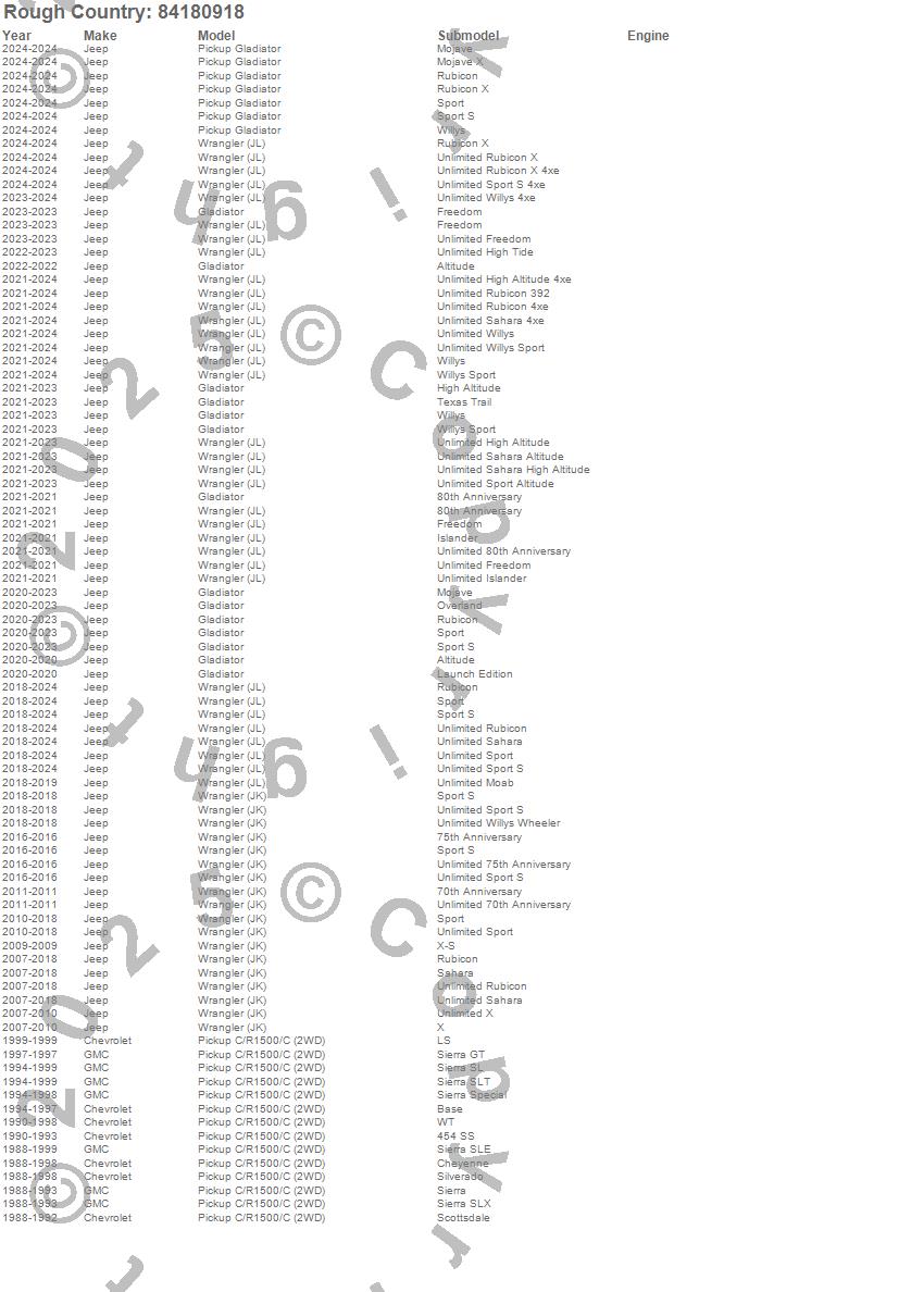 Below is an abbreviated list of applications for the Series 84 Wheel.C1500 Pickup, Durango, Gladiator, Pickup Gladiator, Wrangler (JK), Wrangler (JL), Chevrolet, Dodge, GMC, Jeep, 2025, 2024, 2023, 2022, 2021, 2020, 2019, 2018, 2017, 2016