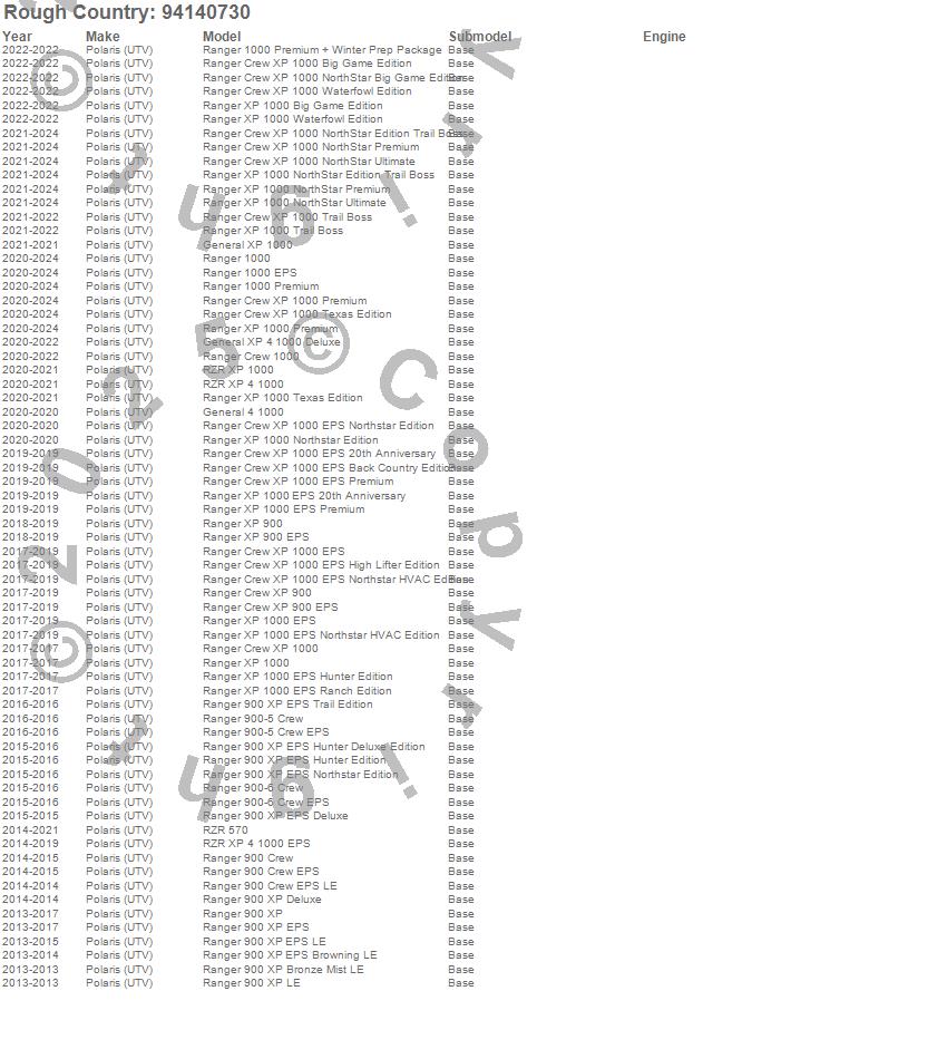 Below is an abbreviated list of applications for the Series 94 Wheel.General 4 1000, General XP 1000, General XP 4 1000 Deluxe, Ranger 1000, Ranger 1000 EPS, Ranger 1000 Premium, Ranger 1000 Premium + Winter Prep Package, Ranger 900 Crew, Ranger 900 Crew EPS, Ranger 900 Crew EPS LE, Ranger 900 XP, Ranger 900 XP Bronze Mist LE, Ranger 900 XP Deluxe, Ranger 900 XP EPS, Ranger 900 XP EPS Browning LE, Ranger 900 XP EPS Deluxe, Ranger 900 XP EPS Hunter Deluxe Edition, Ranger 900 XP EPS Hunter Edition, Ranger 900 XP EPS LE, Ranger 900 XP EPS Northstar Edition
