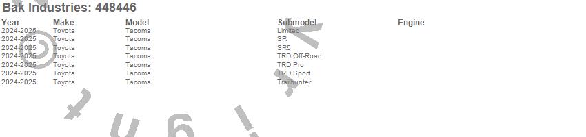 Brand: BAK IndustriesPart Number: 448446Tonneau Cover Type: Black - Aluminum - Matte FinishUPC: 192631047544