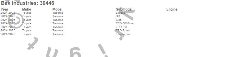 Brand: BAK IndustriesPart Number: 39446Tonneau Cover Type: Blk - Vinyl Top w/ Aluminum Underside - Leather Grain Finish - Rail Mounts Near Top Of Bed Rail - Can Low w/ Drop Down BracketsUPC: 192631047506