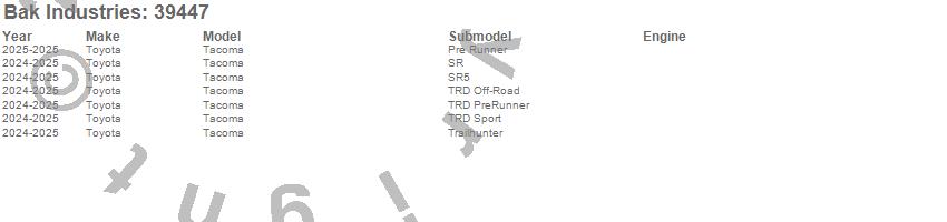 Brand: BAK IndustriesPart Number: 39447Tonneau Cover Type: Blk - Vinyl Top w/ Aluminum Underside - Leather Grain Finish - Rail Mounts Near Top Of Bed Rail - Can Low w/ Drop Down BracketsUPC: 192631047575