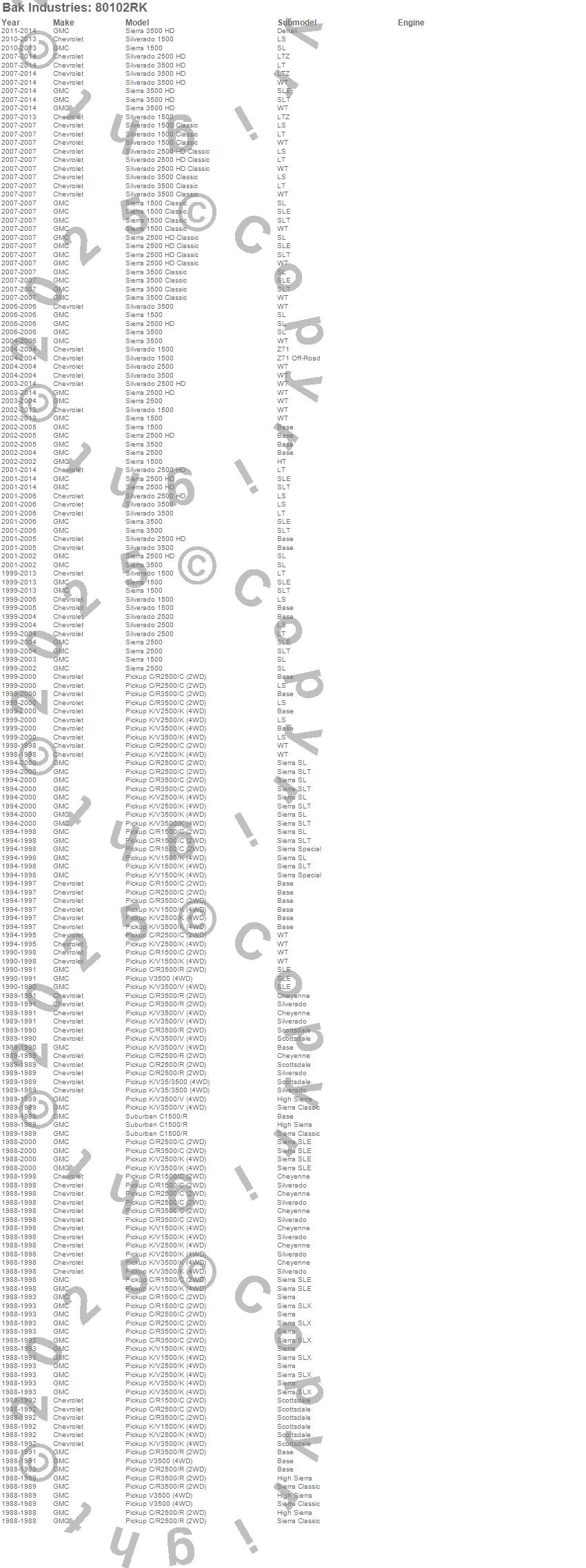 Below is an abbreviated list of applications for the Revolver X4ts Hard Rolling Truck Bed Cover.C1500 Pickup, C2500 Pickup, C3500 Pickup, K1500, K1500 Pickup, K2500 Pickup, K3500 Pickup, R2500 Pickup, R3500 Pickup, Sierra 1500, Sierra 1500 Classic, Sierra 2500, Sierra 2500 HD, Sierra 2500 HD Classic, Sierra 3500, Sierra 3500 Classic, Sierra 3500 HD, Silverado 1500, Silverado 1500 Classic, Silverado 2500