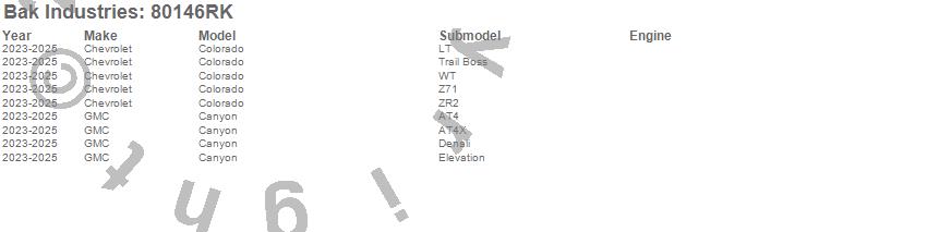 Brand: BAK IndustriesPart Number: 80146RKTonneau Cover Type: Black - Vinyl Top w/ Aluminum Underside - Matte Black FinishUPC: 192631047261