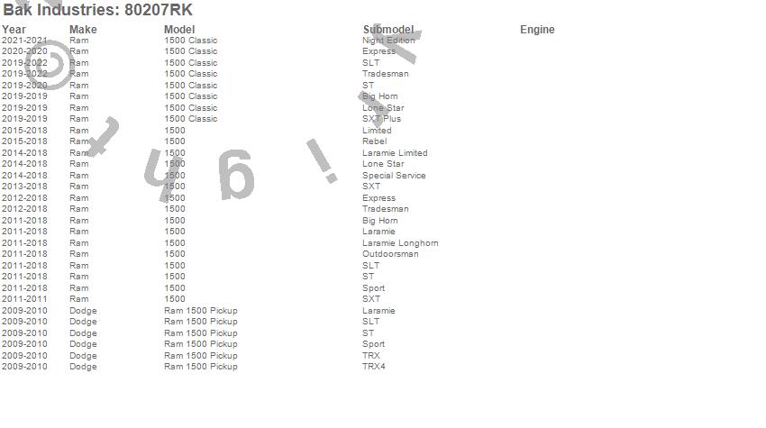 Brand: BAK IndustriesPart Number: 80207RKTonneau Cover Type: Black - Vinyl Top w/ Aluminum Underside - Matte Black FinishUPC: 192631019008