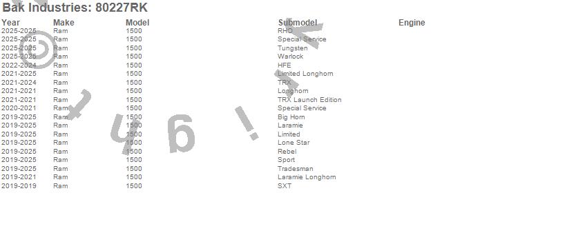 Brand: BAK IndustriesPart Number: 80227RKTonneau Cover Type: Black - Vinyl Top w/ Aluminum Underside - Matte Black FinishUPC: 192631047667
