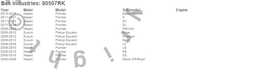 Brand: BAK IndustriesPart Number: 80507RKTonneau Cover Type: Black - Vinyl Top w/ Aluminum Underside - Matte Black FinishUPC: 192631047926