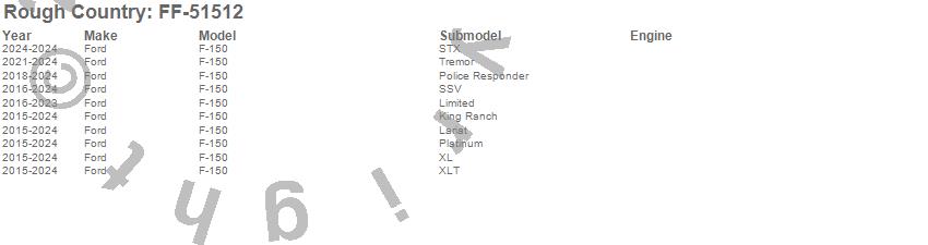 Brand: Rough CountryPart Number: FF-51512Floor Mat Set Type: Front and RearUPC: 840269946103
