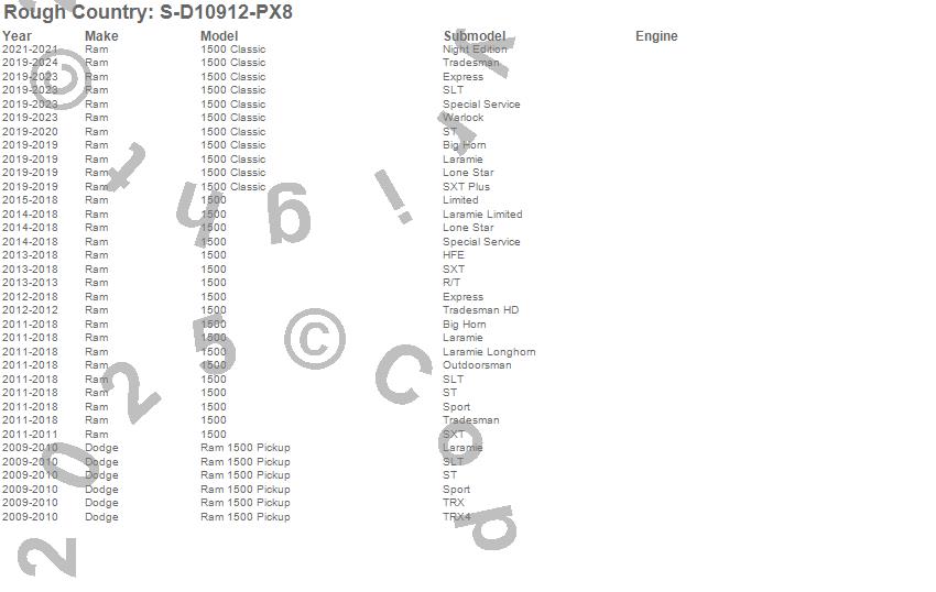 Brand: Rough CountryPart Number: S-D10912-PX8Fender Flare Type: Sport - Black CrystalUPC: 840269952425
