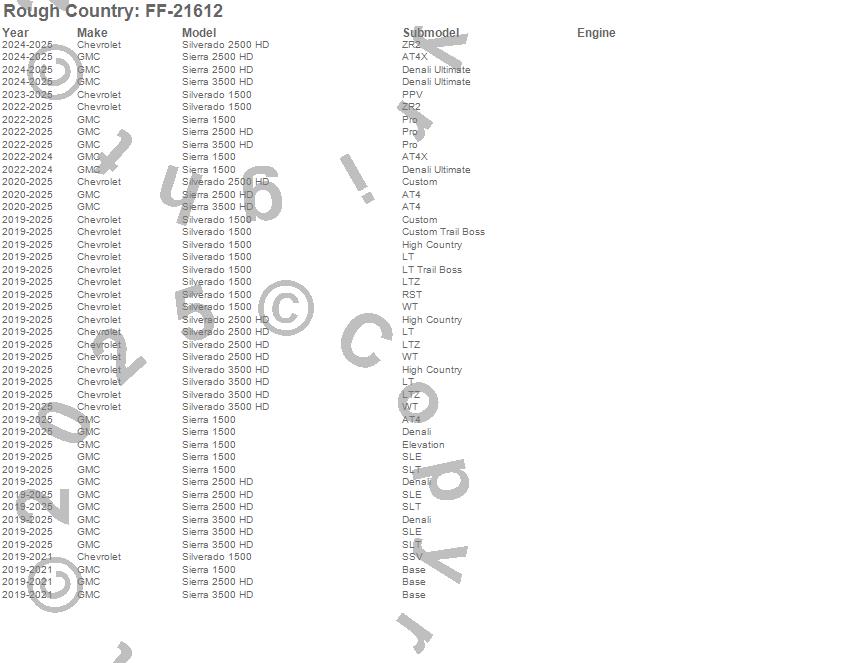 Brand: Rough CountryPart Number: FF-21612Floor Mat Set Type: Front and RearUPC: 840269946097