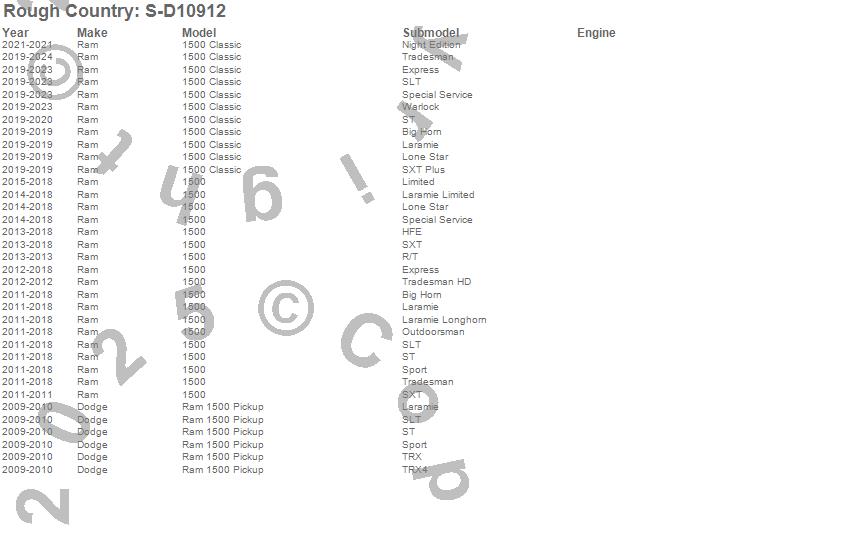 Brand: Rough CountryPart Number: S-D10912Fender Flare Type: Sport - Plastic BumperUPC: 840269948107