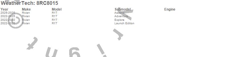 Below is an abbreviated list of applications for the WeatherTech Roll Up Truck Bed Cover.R1T, Rivian, 2025, 2024, 2023, 2022