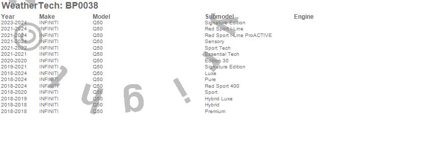 Below is an abbreviated list of applications for the BumperTopper.Q50, INFINITI, 2024, 2023, 2022, 2021, 2020, 2019, 2018