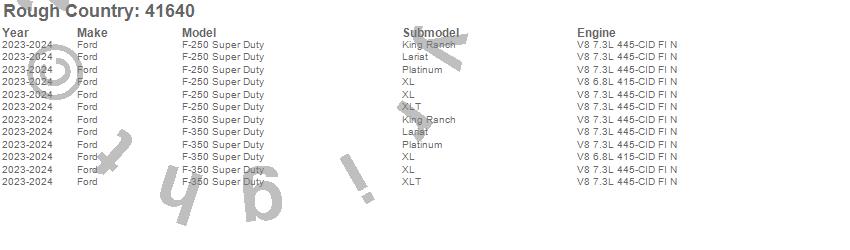 Below is an abbreviated list of applications for the Suspension Lift Kit w/Shocks.F-250 Super Duty, F-350 Super Duty, Ford, 2025, 2024, 2023