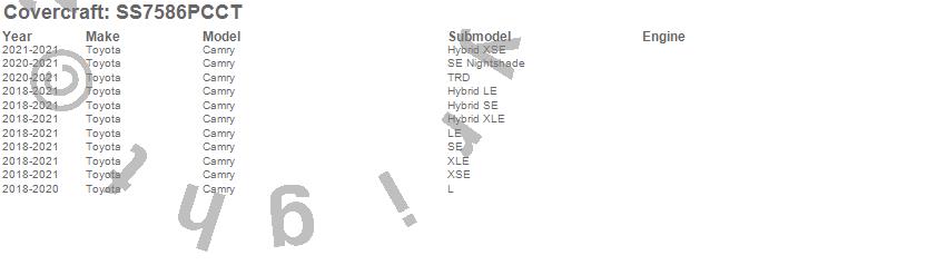 Below is an abbreviated list of applications for the SeatSaver Custom Seat Cover.Camry, Toyota, 2024, 2021, 2020, 2019, 2018
