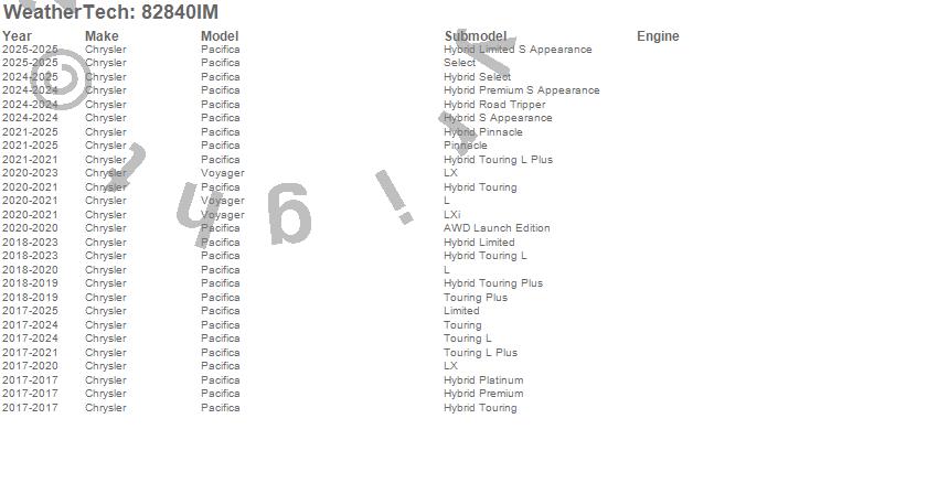Below is an abbreviated list of applications for the Side Window Deflector Set.Pacifica, Voyager, Chrysler, 2026, 2025, 2024, 2023, 2022, 2021, 2020, 2019, 2018, 2017