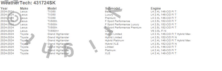 Below is an abbreviated list of applications for the Cargo Liner w/Bumper Protector.Grand Highlander, TX350, TX500h, TX550h+, Lexus, Toyota, 2026, 2025, 2024