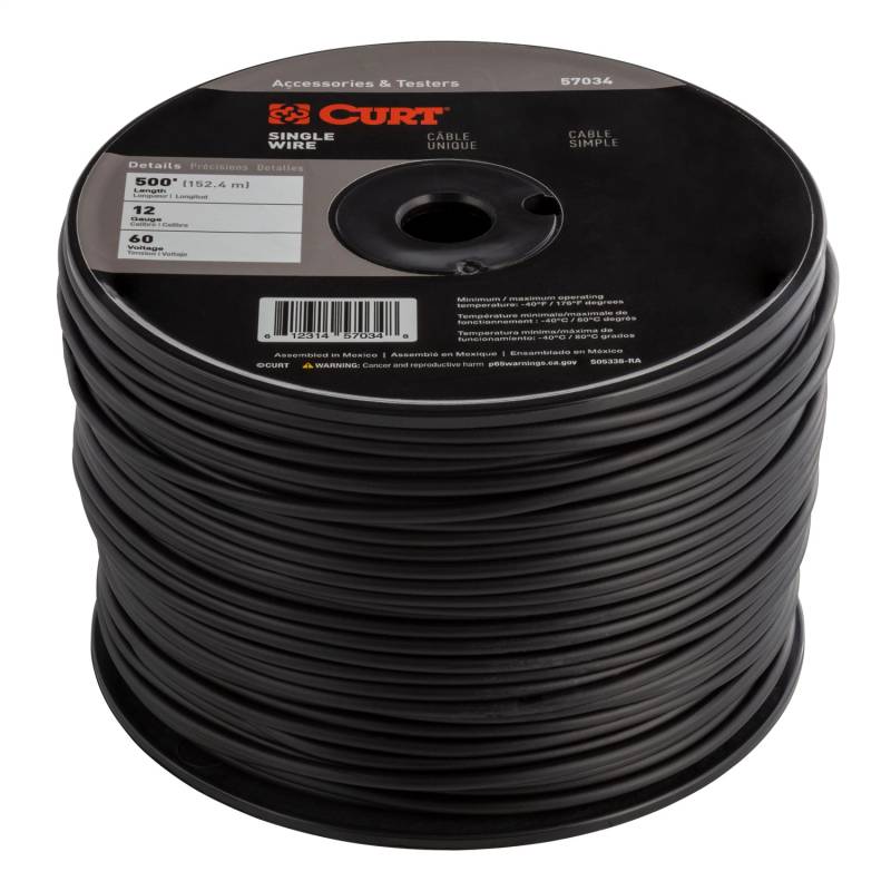 Brand: CURTPart Number: 57034Trailer Wire Type: Black - 500 ft Trailer Wiring Spool - 60 Volt - 12 GaugeUPC: 612314570348