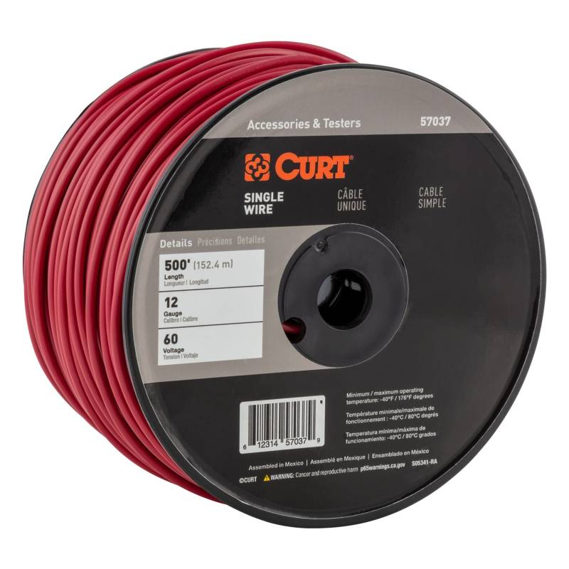 Brand: CURTPart Number: 57037Trailer Wire Type: Red - 500 ft Trailer Wiring Spool - 60 Volt - 12 GaugeUPC: 612314570379