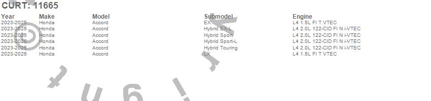 Brand: CURTPart Number: 11665Trailer Hitch Type: 2000 lbs. Gross Trailer Weight - 200 lbs. Tongue WeightUPC: 612314056989
