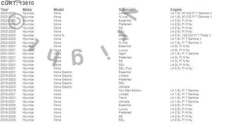 Below is an abbreviated list of applications for the Class III 2 in. Receiver Hitch.Kona, Kona Electric, Kona N, Hyundai, 2023, 2022, 2021, 2020, 2019, 2018