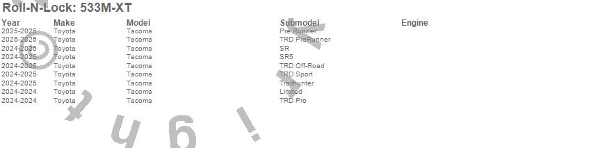 Below is an abbreviated list of applications for the Roll-N-Lock M-Series XT Truck Bed Cover.Tacoma, Toyota, 2025, 2024
