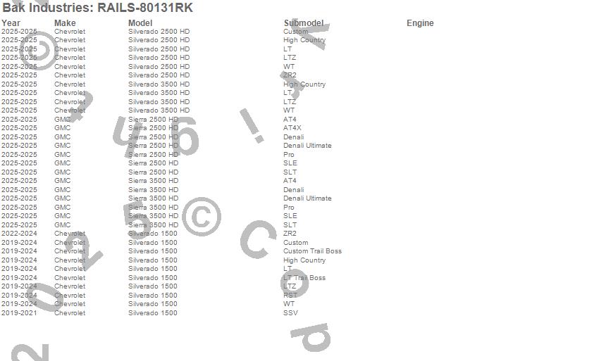 Below is an abbreviated list of applications for the Revolver X4ts Rails.Sierra 2500 HD, Sierra 3500 HD, Silverado 1500, Silverado 2500 HD, Silverado 3500 HD, Chevrolet, GMC, 2025, 2024, 2023, 2022, 2021, 2020, 2019
