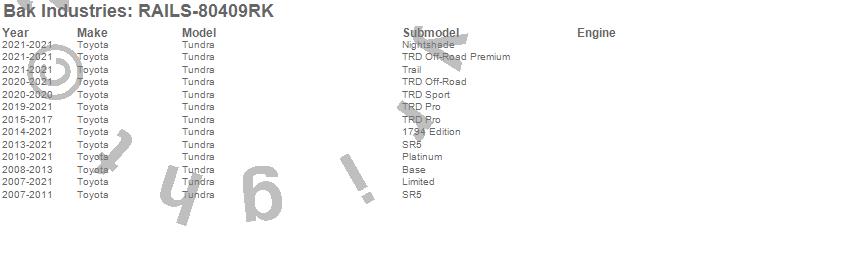 Brand: BAK IndustriesPart Number: RAILS-80409RKTonneau Cover Rail Type: Only T-Slot RailsUPC: 192631046820
