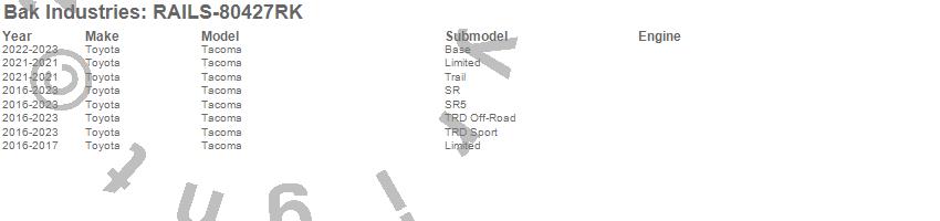 Brand: BAK IndustriesPart Number: RAILS-80427RKTonneau Cover Rail Type: Only T-Slot RailsUPC: 192631046875