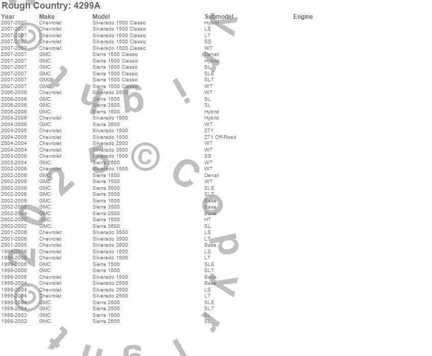 Below is an abbreviated list of applications for the Wheel Well Liner.Sierra 1500, Sierra 1500 Classic, Sierra 2500, Sierra 3500, Silverado 1500, Silverado 1500 Classic, Silverado 2500, Silverado 3500, Chevrolet, GMC, 2007, 2006, 2005, 2004, 2003, 2002, 2001, 2000, 1999