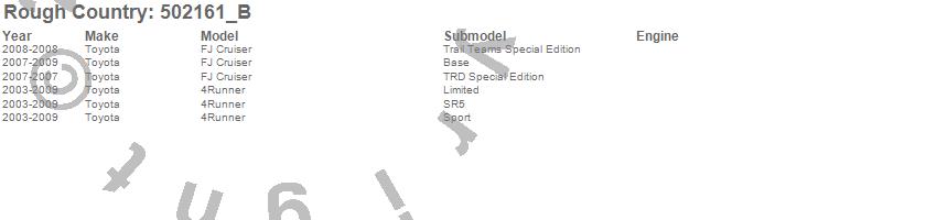 Below is an abbreviated list of applications for the Lifted M1 Struts.4Runner, FJ Cruiser, Toyota, 2009, 2008, 2007, 2006, 2005, 2004, 2003