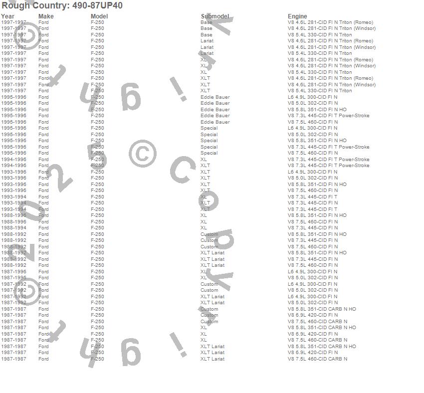 Below is an abbreviated list of applications for the Suspension Lift Kit w/Shocks.F-250, Ford, 1997, 1996, 1995, 1994, 1993, 1992, 1991, 1990, 1989, 1988, 1987