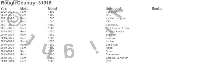 Brand: Rough CountryPart Number: 31016Nerf/Step Bar Type: Adjustable - AluminumUPC: 840269946905