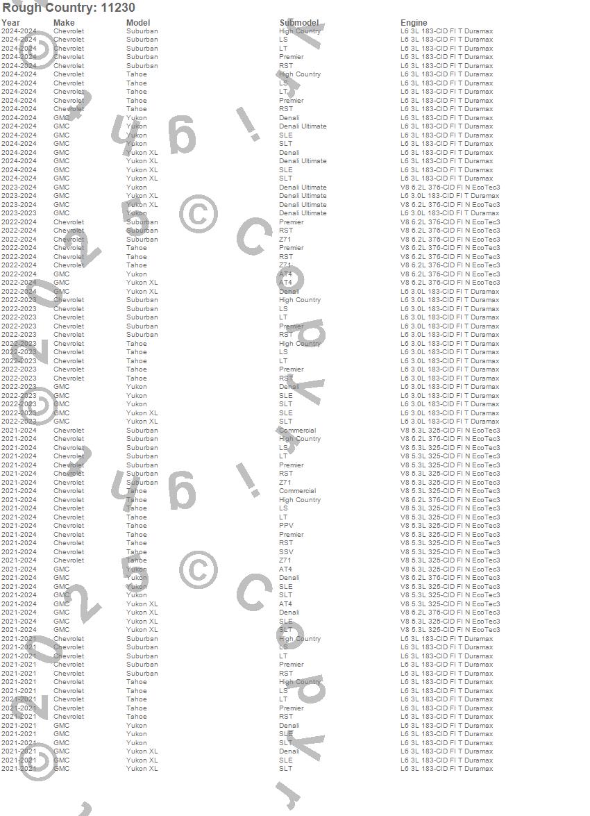 Below is an abbreviated list of applications for the Suspension Lift Kit.Suburban, Tahoe, Yukon, Yukon XL, Chevrolet, GMC, 2025, 2024, 2023, 2022, 2021