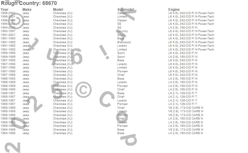 Below is an abbreviated list of applications for the Suspension Lift Kit w/Shocks.Cherokee (XJ), Jeep, 2001, 2000, 1999, 1998, 1997, 1996, 1995, 1994, 1993, 1992, 1991, 1990, 1989, 1988, 1987, 1986, 1985, 1984