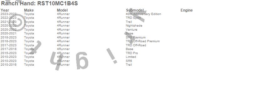 Below is an abbreviated list of applications for the Legend Running Steps.4Runner, Toyota, 2023, 2022, 2021, 2020, 2019, 2018, 2017, 2016, 2015, 2014, 2013, 2012, 2011, 2010