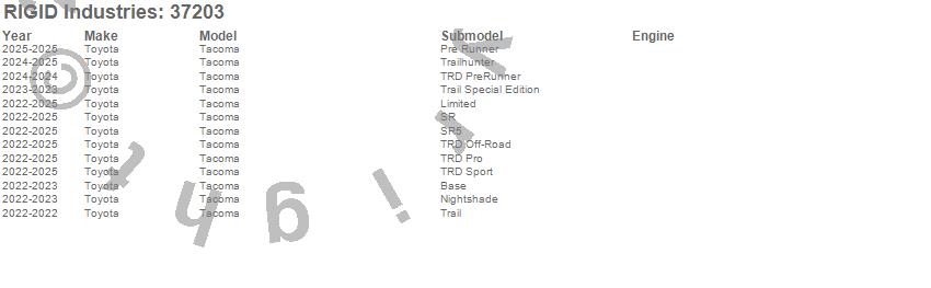 Brand: Rigid IndustriesPart Number: 37203Fog Light Bracket Type: UPC: 849774036439