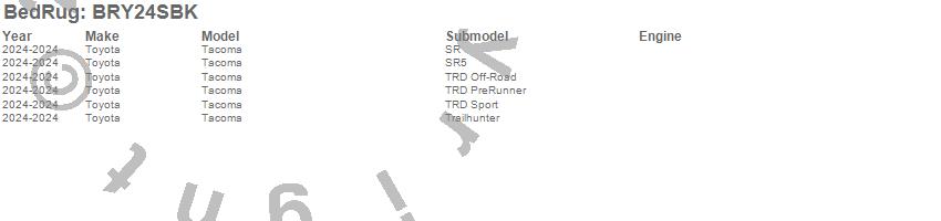 Brand: BedRugPart Number: BRY24SBKTruck Bed Liner Type: Polypropylene - CharcoalUPC: 870558007871