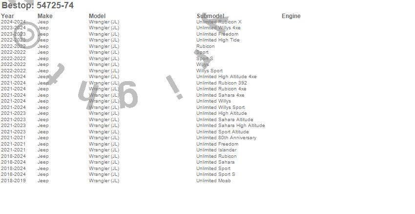 Below is an abbreviated list of applications for the Supertop Squareback Soft Top.Wrangler, Wrangler (JL), Jeep, 2026, 2025, 2024, 2023, 2022, 2021, 2020, 2019, 2018