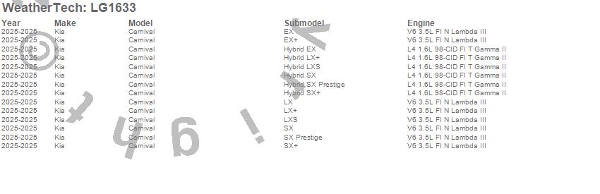 Below is an abbreviated list of applications for the LampGard.Carnival, Kia, 2025