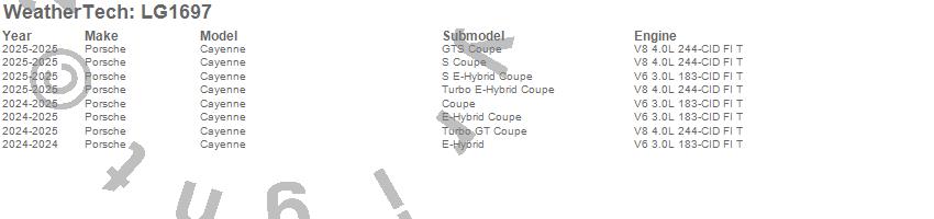 Below is an abbreviated list of applications for the LampGard.Cayenne, Porsche, 2025, 2024
