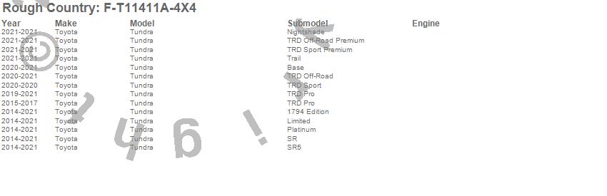 Below is an abbreviated list of applications for the Pocket Fender Flares.Tundra, Toyota, 2021, 2020, 2019, 2018, 2017, 2016, 2015, 2014