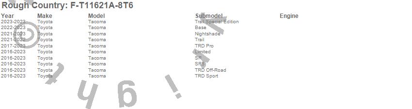 Brand: Rough CountryPart Number: F-T11621A-8T6Fender Flare Type: Voodoo BlueUPC: 840269956348