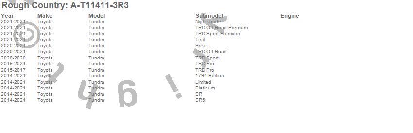 Below is an abbreviated list of applications for the Fender Flares.Tundra, Toyota, 2021, 2020, 2019, 2018, 2017, 2016, 2015, 2014