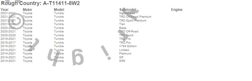 Below is an abbreviated list of applications for the Fender Flares.Tundra, Toyota, 2021, 2020, 2019, 2018, 2017, 2016, 2015, 2014