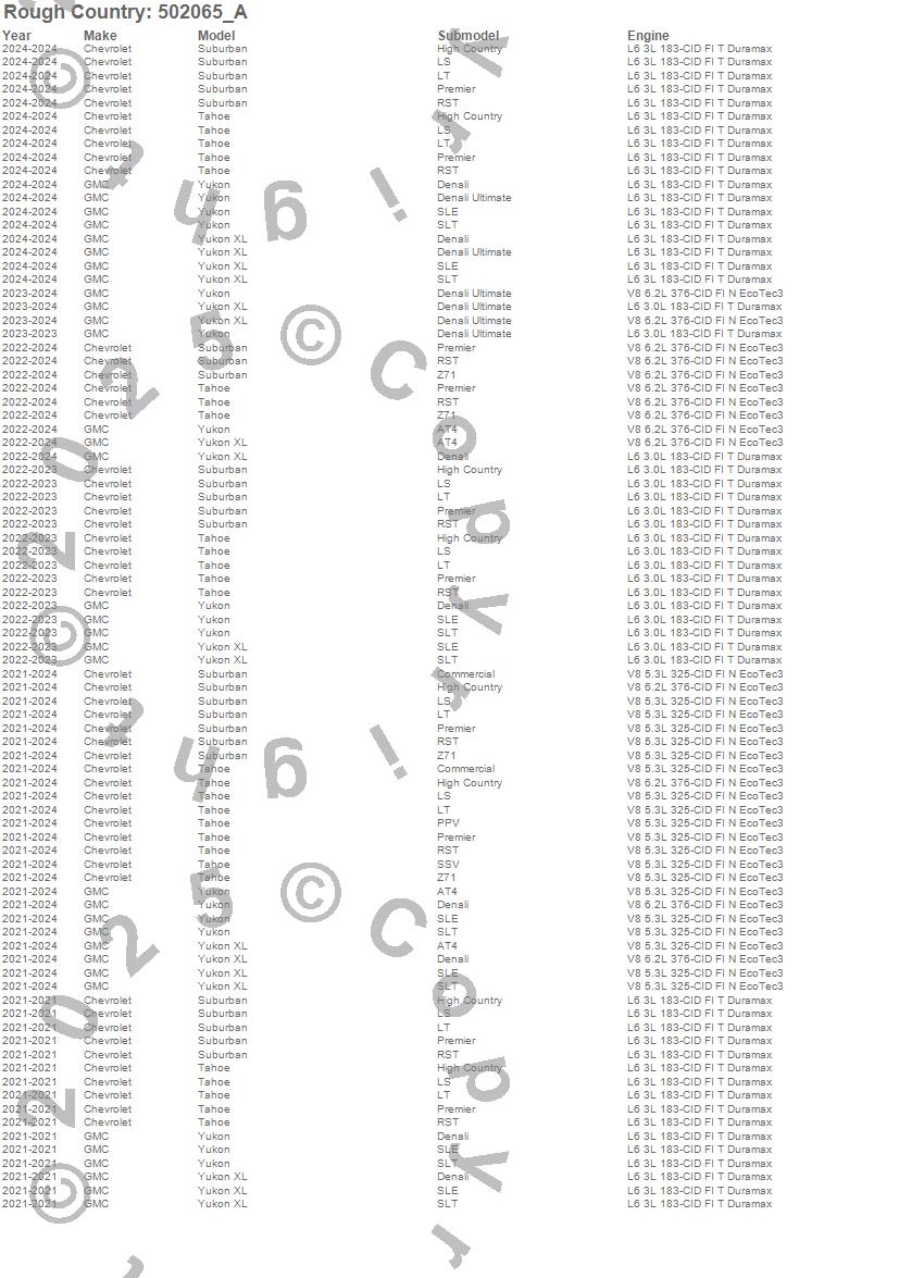 Below is an abbreviated list of applications for the Leveling Strut Kit.Suburban, Tahoe, Yukon, Yukon XL, Chevrolet, GMC, 2025, 2024, 2023, 2022, 2021