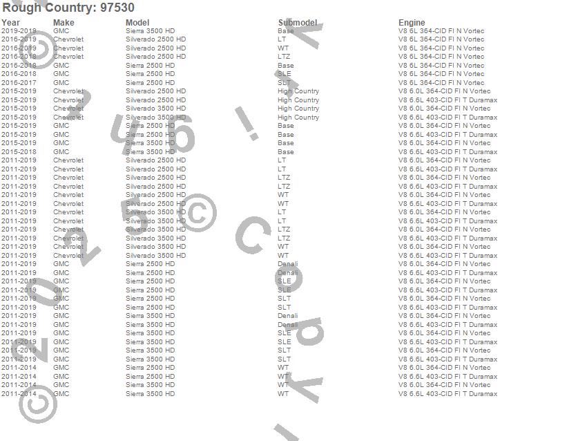 Below is an abbreviated list of applications for the Suspension Lift Kit w/Shocks.Sierra 2500 HD, Sierra 3500 HD, Silverado 2500 HD, Silverado 3500 HD, Chevrolet, GMC, 2019, 2018, 2017, 2016, 2015, 2014, 2013, 2012, 2011